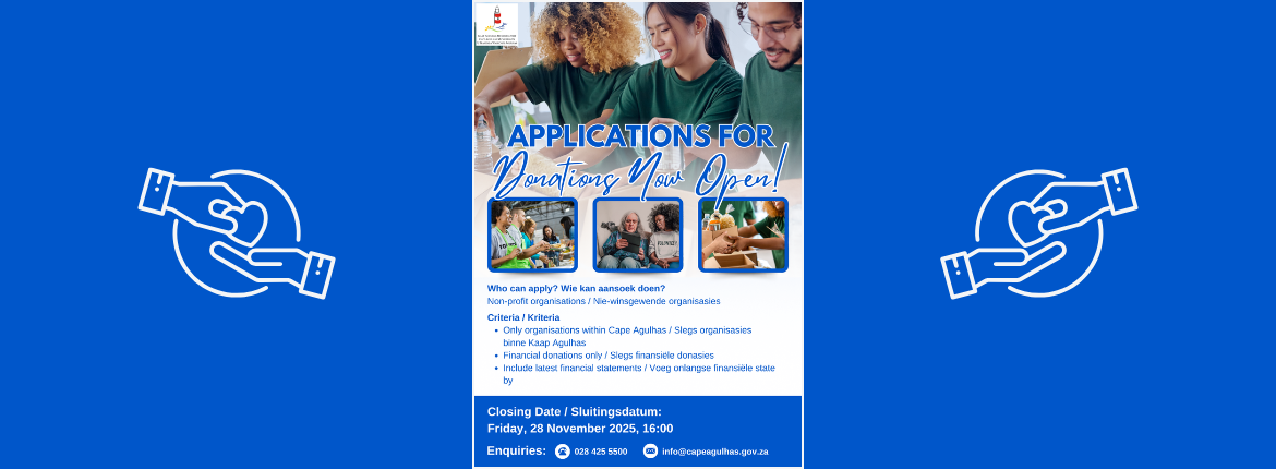 Kennis geskied hiermee dat die Raad skriftelike aansoeke inwag vir die toekenning van donasies in die 2025/26 -boekjaar, onder sekere voorwaardes en in terme van die onderstaande Donasiebeleid: