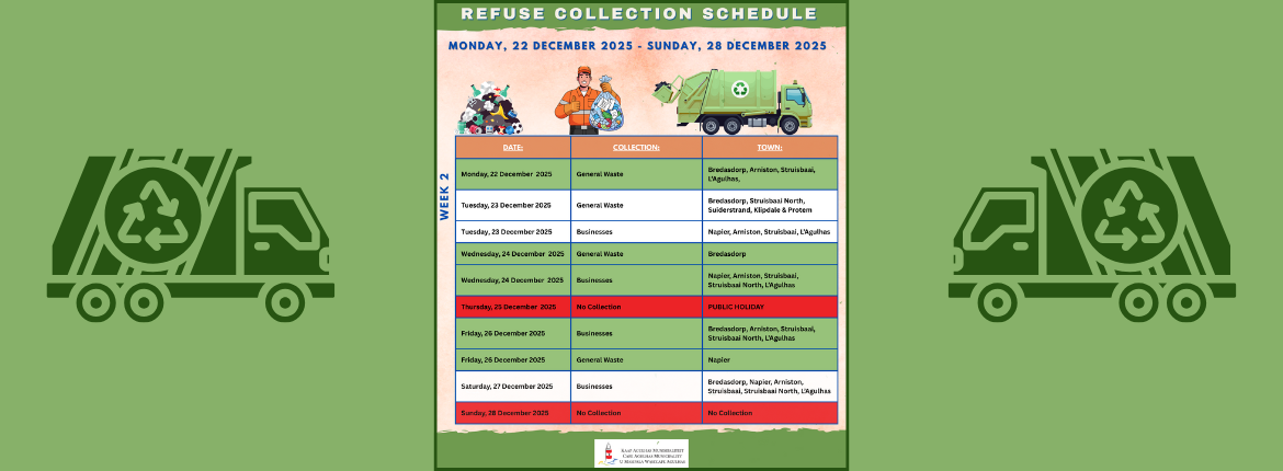 NOTICE: Refuse Collection Schedule for 16 – 21 December 2025 Cape Agulhas Municipality wishes to inform residents of the refuse collection schedule for the period Tuesday, 16 December 2025 to […]