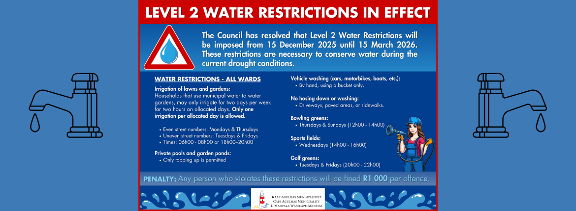 LEVEL 2 WATER RESTRICTIONS IN EFFECT 1. That water restrictions (Level 2) be imposed from 15 December 2025 until 15 March 2026, as follows: 1.1 Households that use municipal water […]