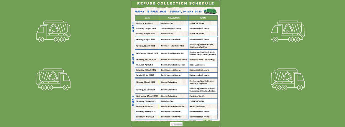 REFUSE COLLECTION SCHEDULE 16 JUNE 2025 – 20 JUNE 2025 MONDAY, 16 JUNE 2025 Businesses in all towns TUESDAY, 17 JUNE 2025 Normal Monday Collection Bredasdorp, Waenhuiskrans, Struisbaai, L’Agulhas WEDNESDAY, […]