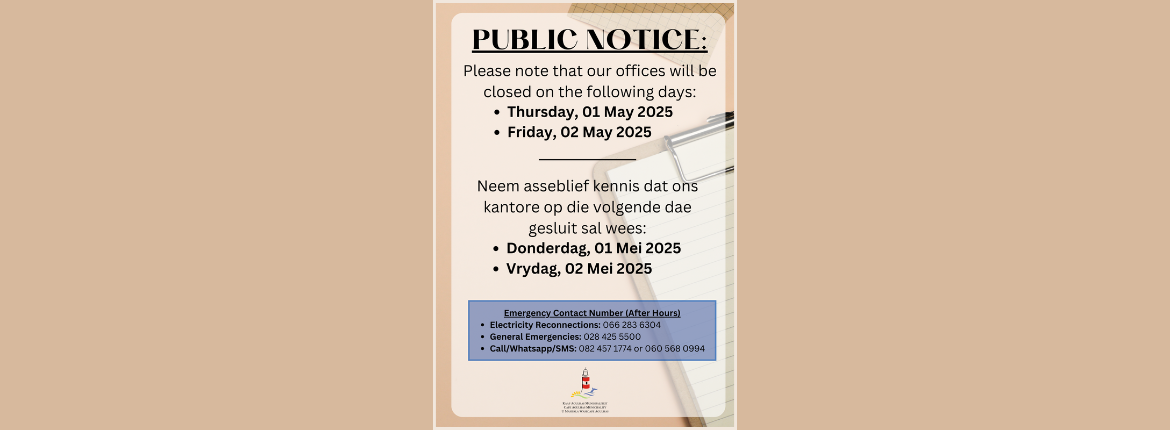 PUBLIC NOTICE: The Cape Agulhas Municipality Building Inspectors will be attending a three-day Skills Development & Training Course on the following dates: -Wednesday, 21 May 2025 -Thursday, 22 May 2025 […]